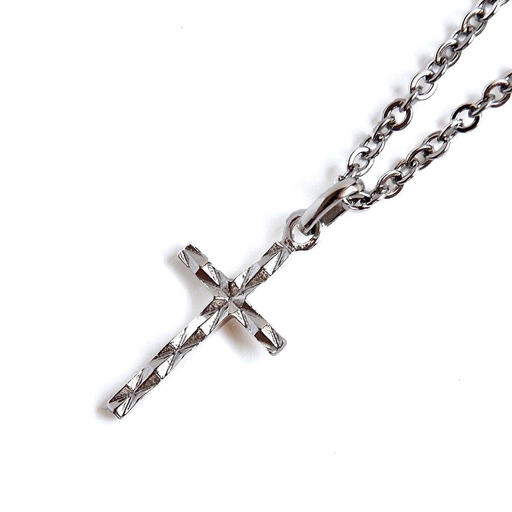 シルバー925を使用したクロスモチーフにダイヤ型のカットを入れたトップが小ぶりながら上品に胸元で輝く一点。チェーンは45cmと55cmをご用意しております。ネックレスを重ね付けをされる方には55cmをお勧めします。 ※チェーン45cmはネックレス単体でも存在感を演出するため、チェーンのコマに若干の厚みを持たせております。 トップサイズ:29mm×12mm (バチカンを含む) チェーン 45cm 55cm アジャスター : なし 使用貴金属 トップ : シルバー925 ネックレスチェーン : 316Lサージカルステンレス