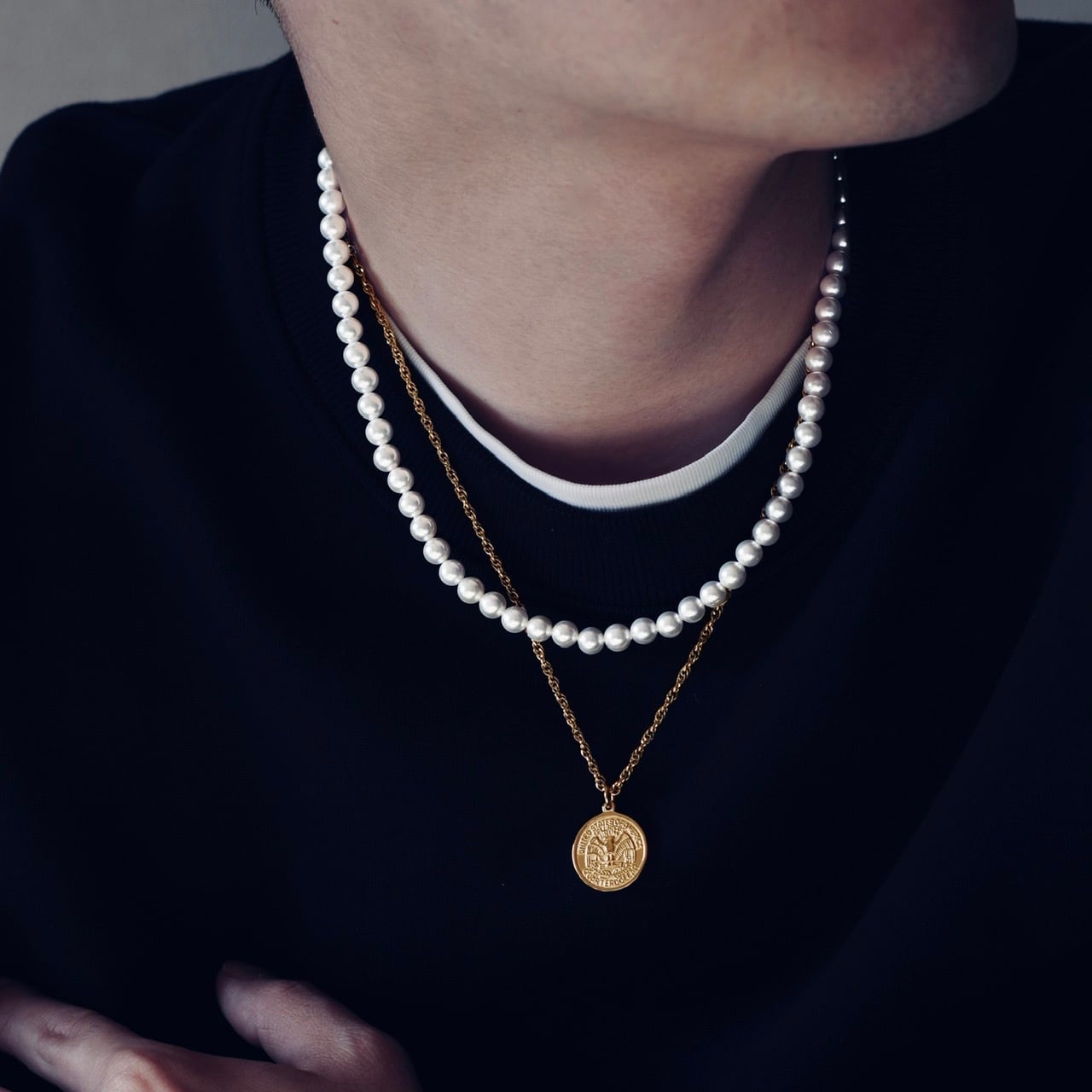 GOLD COIN NECKLACE ゴールドコインネックレス ゴールドのコインチャームにロープチェーンを組み合わせた個性的なネックレス。裏面にもデザインを施しているため、リバーシブルでお使い頂けます。 ・ユニセックスなデザインの為、ペアで着用して頂いてもお洒落な一点となっております。 ・低価格ながら高品質なステンレスを使用しているため、耐久性に優れ、長く愛用していただけます。 サイズ:直径1.7cm ステンレスチェーン:50cm アジャスター : なし 使用貴金属:ステンレス